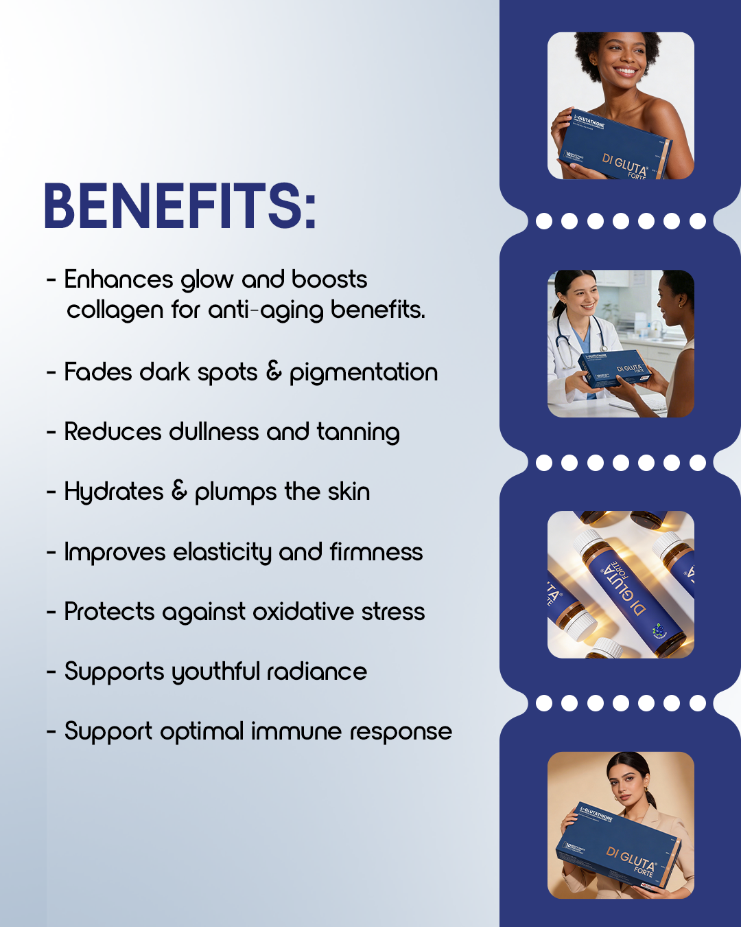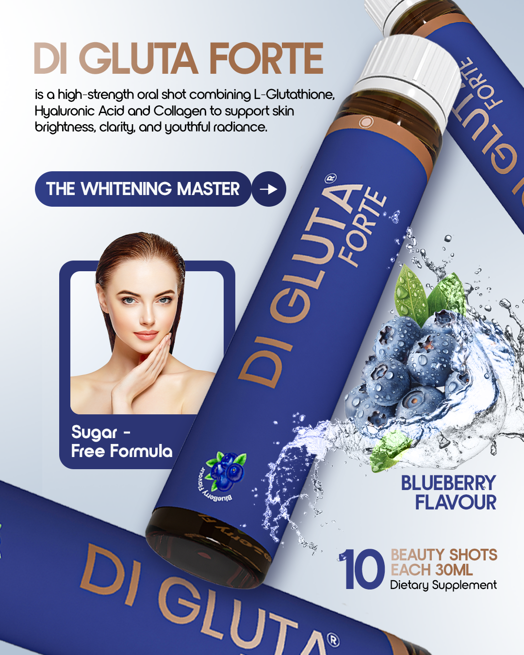 DI Gluta Forte is a high-strength oral shot combining L-Glutathione, Hyaluronic Acid and Collagen to support skin brightness, clarity, and youthful radiance.