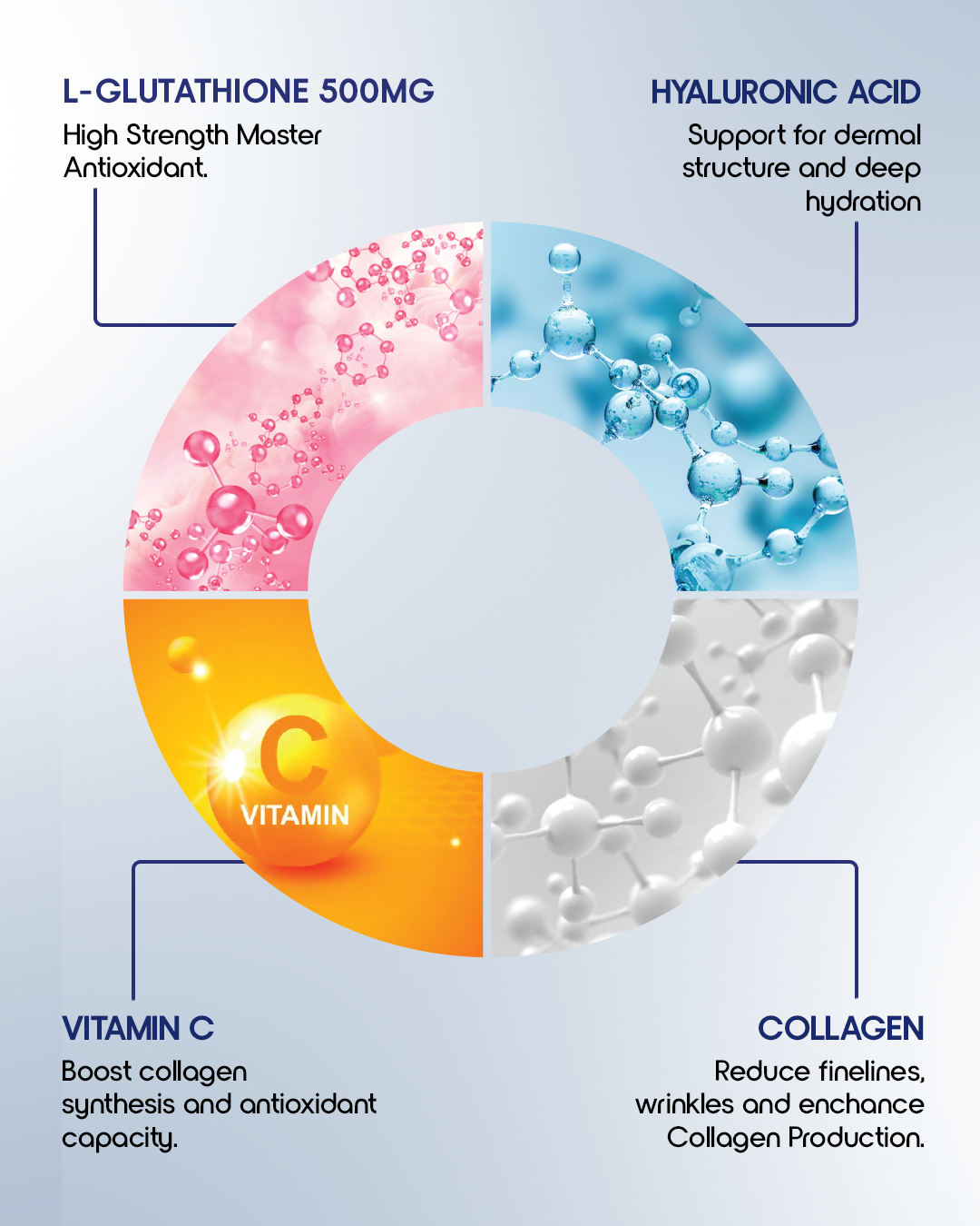 L-Glutathione (USP) 500mg, CoQ10 (USP), Sodium Ascorbate (USP), Collagen-I (USP), Hyaluronic Acid (USP), Vitamin B1 (USP), Vitamin B2 (USP), Vitamin B6 (USP), Green Tea (USP), Grape Extract (USP)